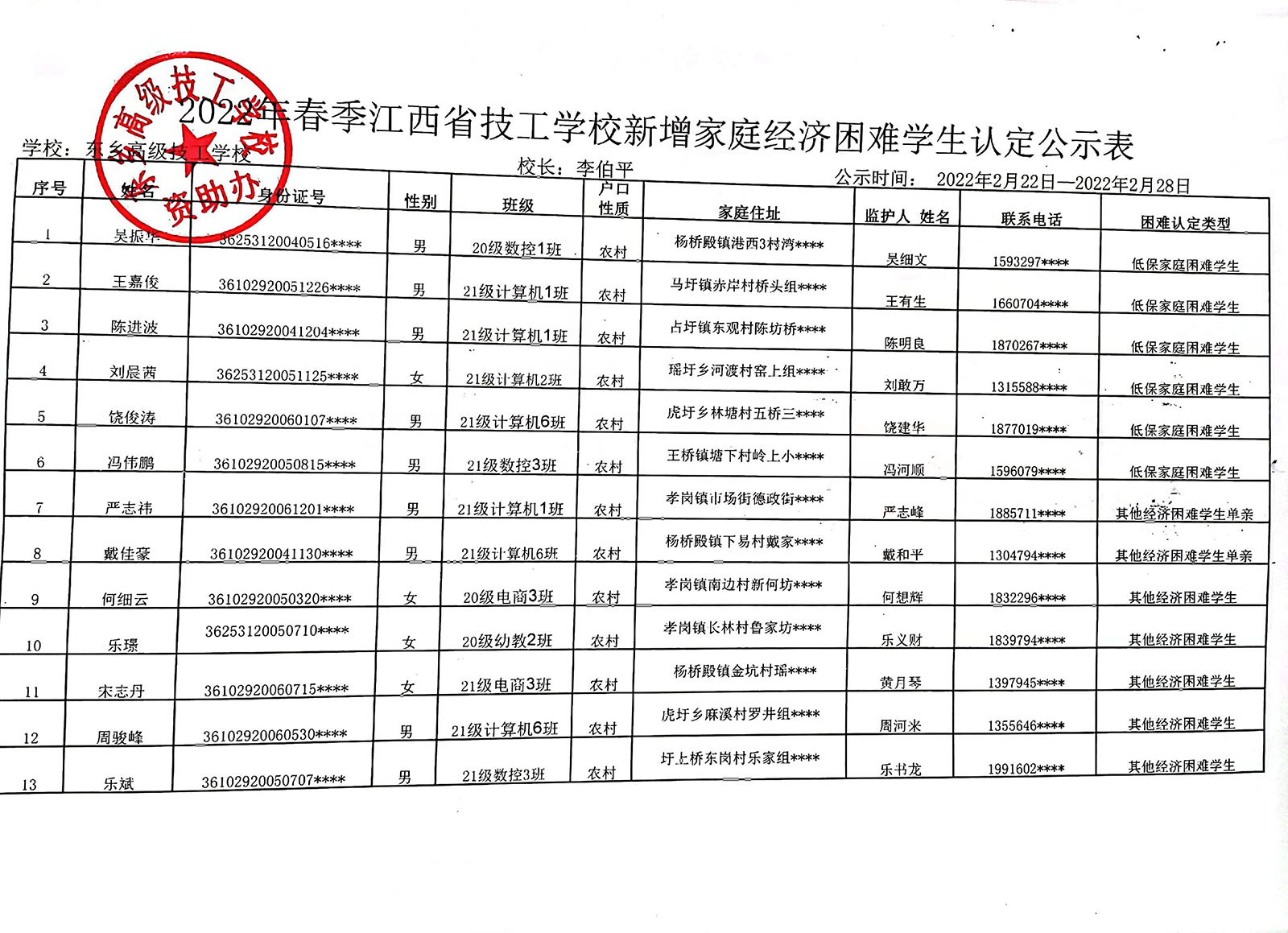 2022年春季,根据《江西省家庭经济困难学生认定暂行办法》(赣教发[2019]6号)等有关文件规定,经学校评委会认定初审通过,确定我校20级数控1班吴振华等13人为本学期新增家庭经济困难学生。现对以上人员的认定结果进行公示(名单详见附件1),公示期5天。欢迎广大师生监督,监督举报电话:0794-4274609。