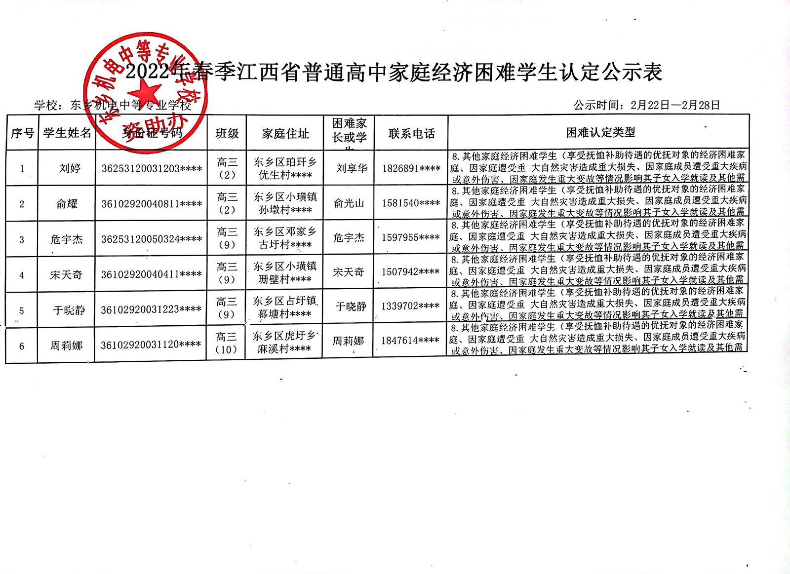 2022年春季,根据《江西省家庭经济困难学生认定暂行办法》(赣教发[2019]6号)等有关文件规定,经学校评委会认定初审通过,确定我校高三(2)班刘婷等6人为本学期新增家庭经济困难学生。现对以上人员的认定结果进行公示(名单详见附件),公示期5天。欢迎广大师生监督,监督举报电话:0794-4274609。