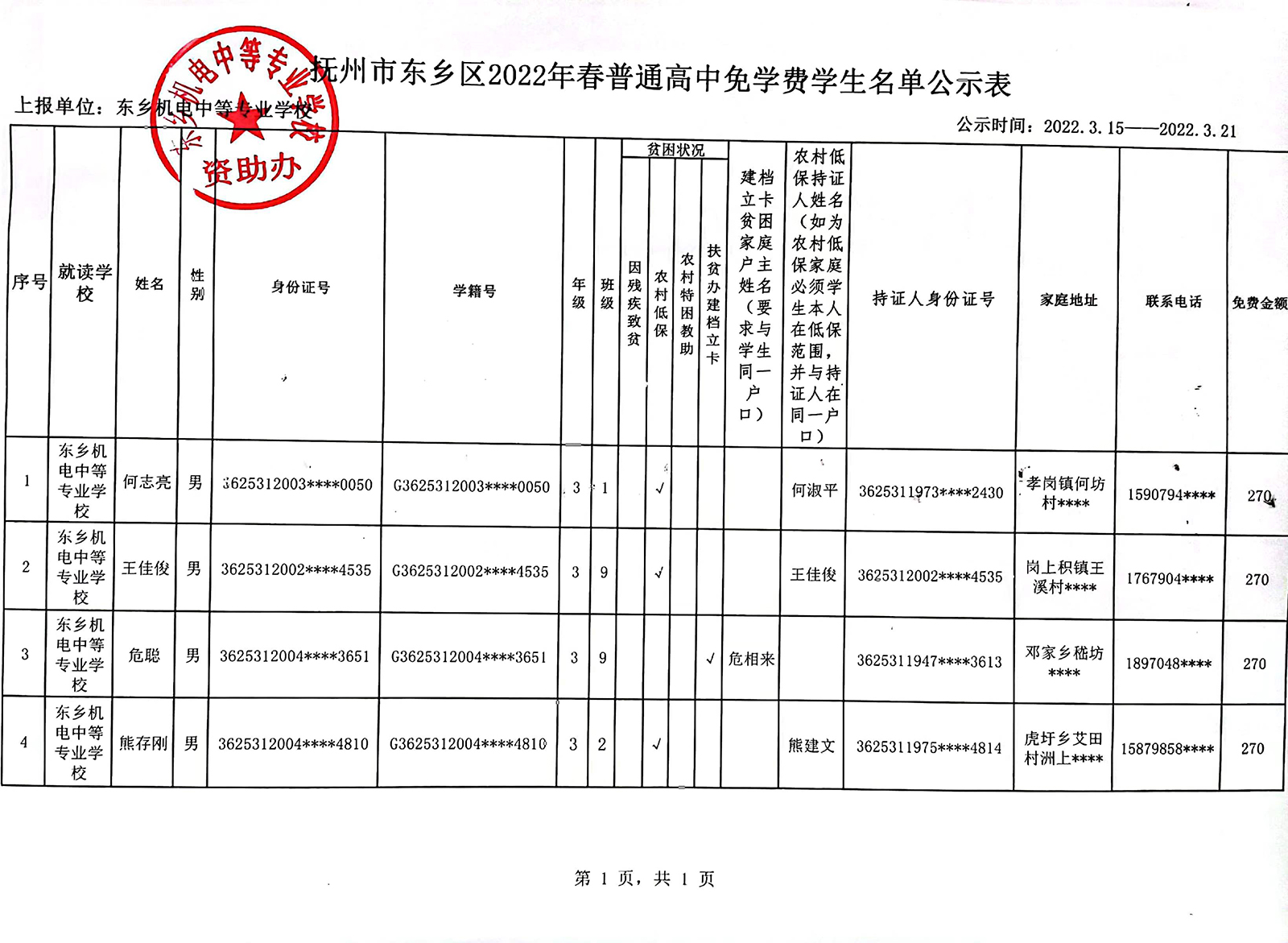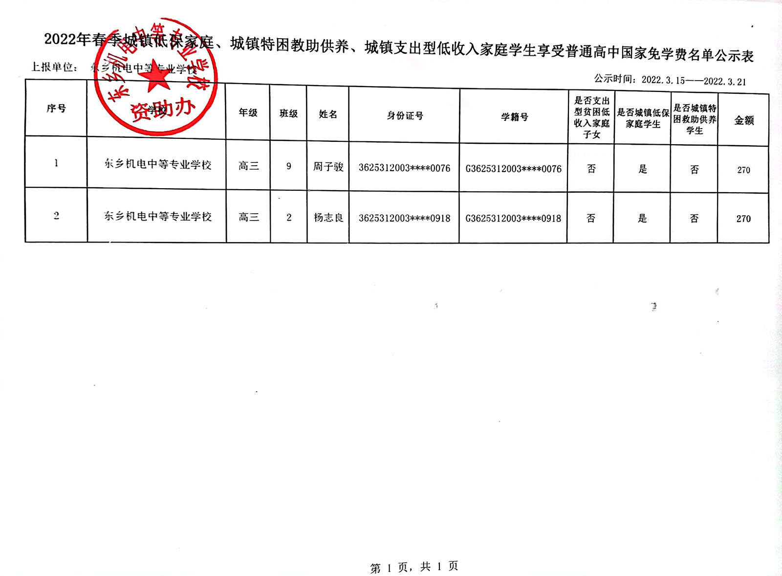 2022年春季,根据国家资助政策,经学校三级初审通过,确定我校普高国家免学费6人,均符合国家免学费享受条件。我校普高国家免学费标准:270元/人/学期。现对以上人员进行初审公示(名单详见附件),公示期5天。欢迎广大师生监督,监督举报电话:0794-4274609。