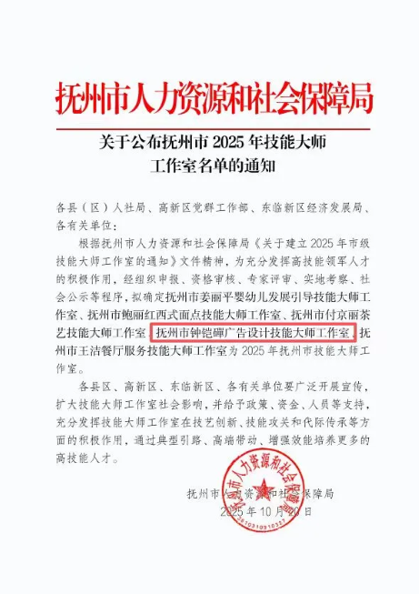 10月20日,抚州市人力资源和社会保障局公布2025年抚州市技能大师工作室名单,抚州技师学院钟铠磾广告设计技能大师工作室成功入选。