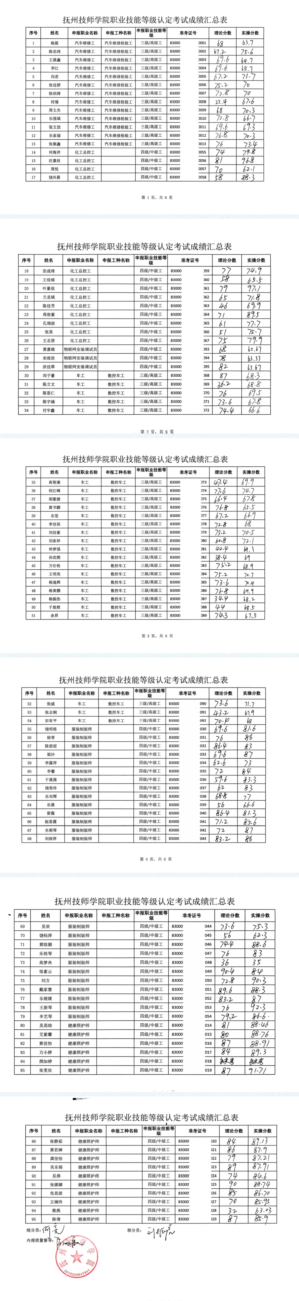 抚州技师学院在2025年12月对我院23级技工籍共95名学生开展职业工种为车工三级、化工总控工四级、服装制版师四级、健康照护师四级、物联网安装调试员四级及汽车维修工三级认定考核,经理论、实操等考核程序,现将考试成绩予以公示: